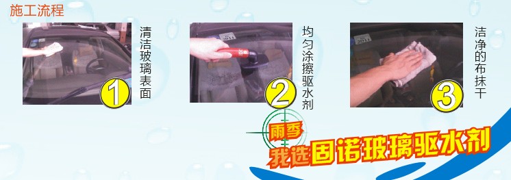 操作非常方便,只需把玻璃用濕布抹一抹,接著用固諾玻璃驅(qū)水劑擦一擦。隔5分鐘后,再用潔凈的布抹干,完畢收工。整個(gè)過程只需8分鐘不到,效果可長(zhǎng)達(dá)30天。