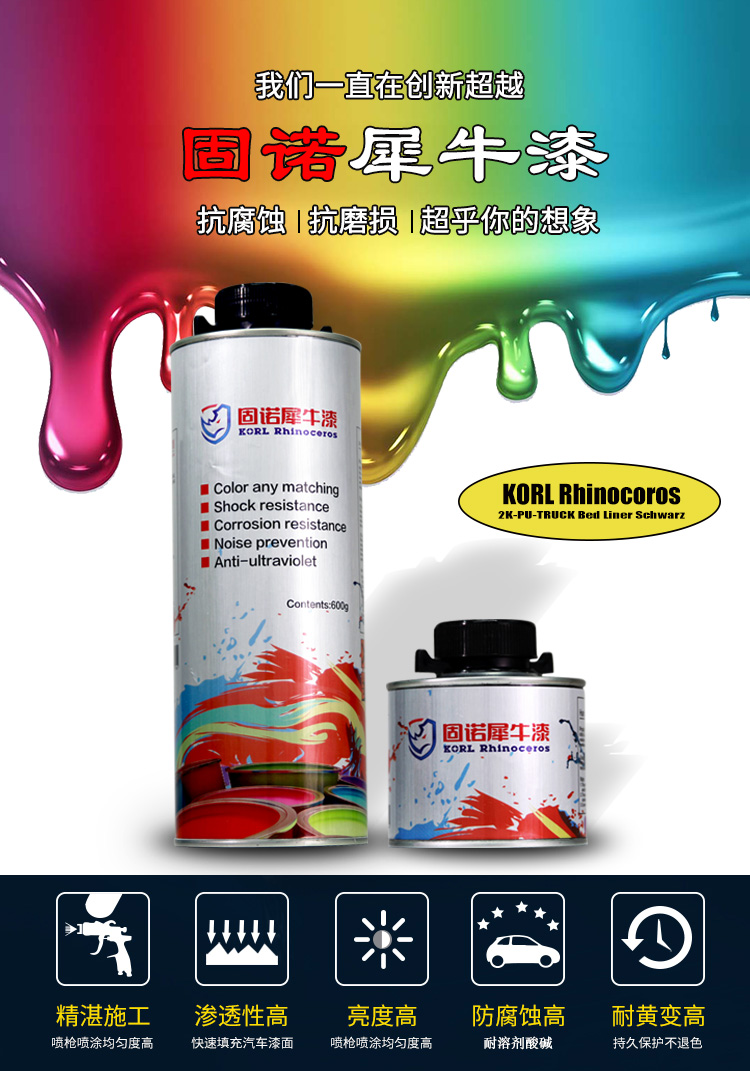 固諾犀牛漆是一種防護(hù)型2K聚氨脂涂料,用于高機(jī)械要求的表面涂層。固化后的產(chǎn)品具有抗沖擊、抗劃傷、隔音、耐候、抗紫外線、抗多種化學(xué)物質(zhì),如液壓油、燃料、動(dòng)物殘留物、鹽水等。