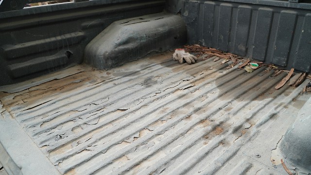 生銹起皮掉漆的內(nèi)部車廂,施工前需要清理干凈,把生銹破爛的漆皮搞掉,沖洗干凈吹干。