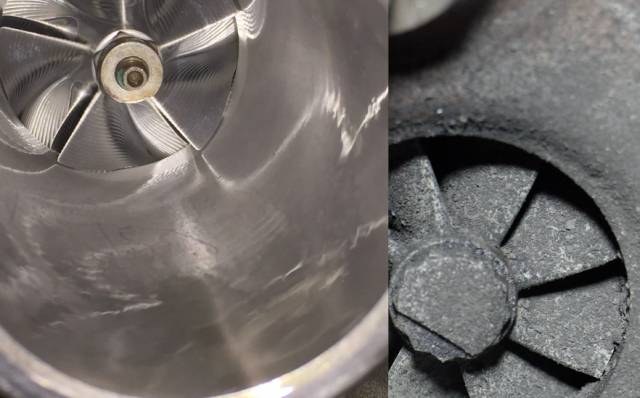 渦輪扇葉運作會因為在高溫油氣和空氣顆粒物的作用下形成厚厚的積碳,影響渦輪的使用效果和零件壽命,造成怠速不穩(wěn),動力損失、油耗增加等等問題。因此,清理渦輪部件的積碳可以恢復(fù)渦輪增壓器的最佳狀態(tài)。