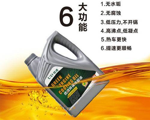 優(yōu)道無水環(huán)保冷卻油(冷卻液)采用高沸點(diǎn)結(jié)合高效的抗泡配方,并參考德國國家實(shí)驗(yàn)室冷卻劑抗腐技術(shù),由高級多元醇,抗氧劑,防氣蝕劑等多種添加劑精制而成,沸點(diǎn)高凝點(diǎn)低。(沸點(diǎn):190℃ 凝點(diǎn):-60℃)。導(dǎo)熱強(qiáng),控溫性能好,對金屬不腐蝕,不產(chǎn)生水垢,車底消除開鍋的煩惱,本產(chǎn)品無害節(jié)能環(huán)保,大大提高發(fā)動(dòng)機(jī)性能,顯著的經(jīng)濟(jì)性,降低油耗,減少維修,一次注入,終身使用。