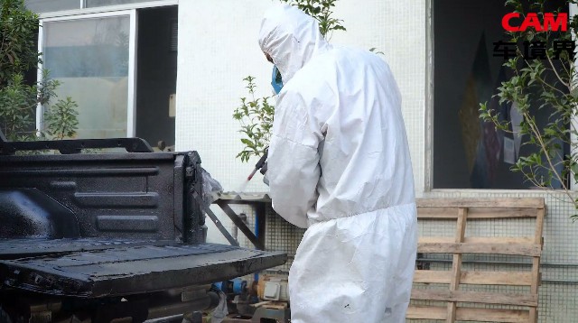 噴漆師傅準(zhǔn)備就緒,穿戴好防護(hù)服和工作,進(jìn)行施工。因?yàn)槭瞧たㄜ?,平常載貨比加多,所以師傅選擇噴涂粗糙紋理,施立盾猛禽漆粗糙紋理的硬度可以達(dá)到6H,干燥后,可以起到防磨損,防水,防腐蝕的作用。