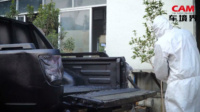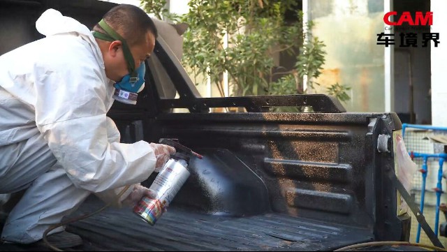 師傅在仔細(xì)噴涂,保證完全封閉車身。