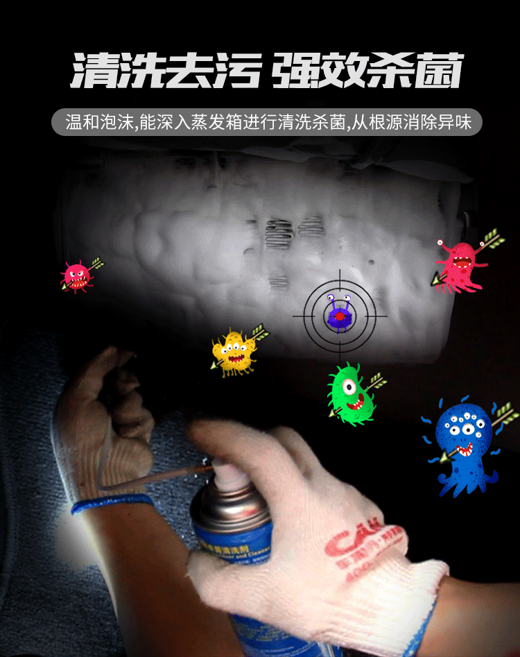 將已經搖勻的清洗劑噴頭對準空調濾芯的位置,里面的吸力會將清洗劑吸入,從而進行空調管道的清洗。其中特別要注意的是,清洗劑的軟管不要距離鼓風機太近,防止被吸入。