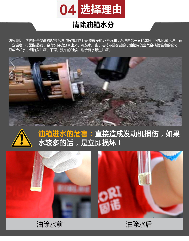 本產(chǎn)品能有效清除汽油箱中的水分,改善汽油燃燒,防止燃油系統(tǒng)生銹腐蝕,保持燃油系統(tǒng)內(nèi)部的清潔,清除噴油嘴、燃燒室中的積碳等