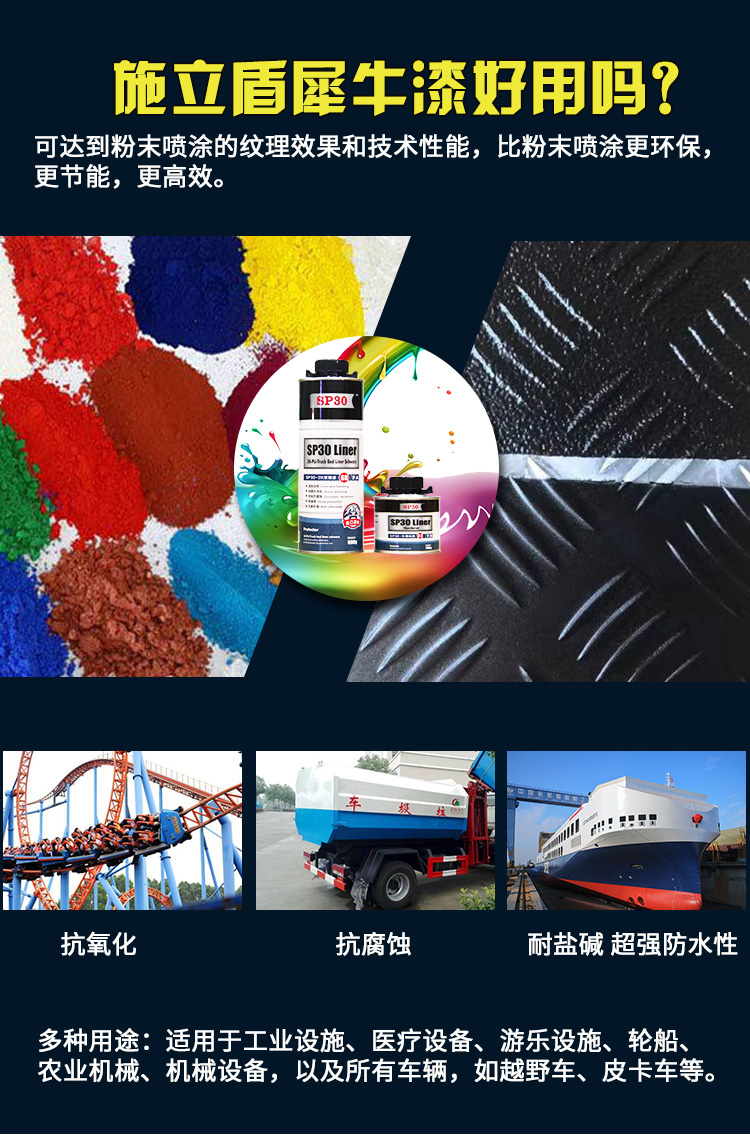 SP30-2K紋理漆是一種 防護(hù)型2K聚氨脂涂料,用于高機(jī)械要求的表面涂層。固化后的產(chǎn)品具有抗沖擊、抗劃傷、隔音、耐候、抗紫外線、抗多種化學(xué)物質(zhì),如液壓油、燃料、動物殘留物、鹽水等。